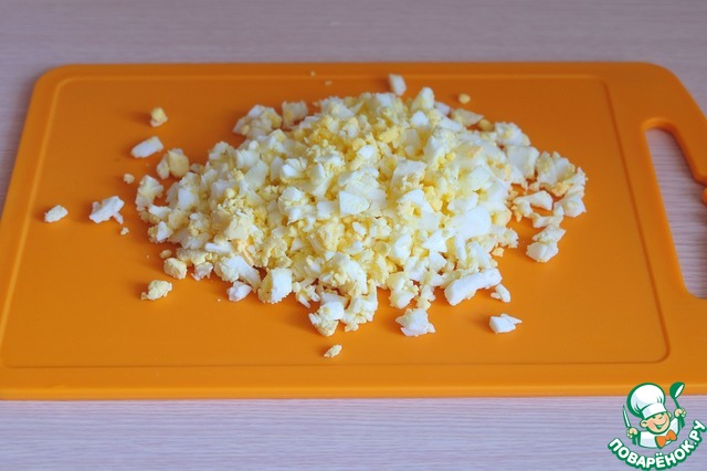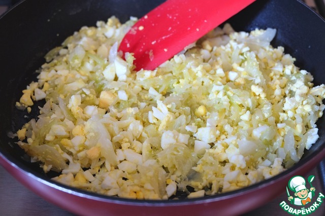 Сыр натереть на терке, посыпать яично-капустную начинку сыром.