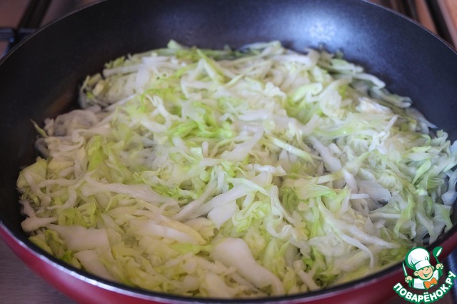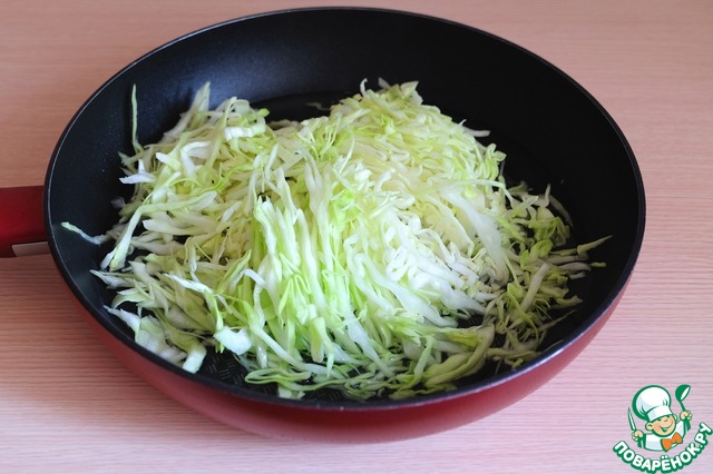 В сковороду добавить не большое количество воды, примерно 1/2 стакана, выложить капусту.