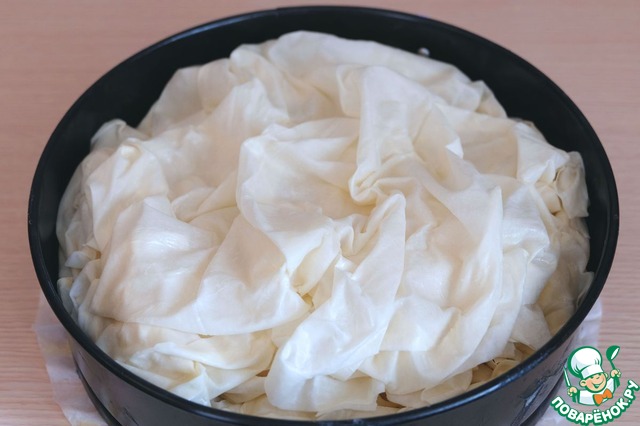Для высоких пирогов приготовленных из теста фило, лучше использовать разъемные формы. Дно разъемной формы выстлать пергаментом.