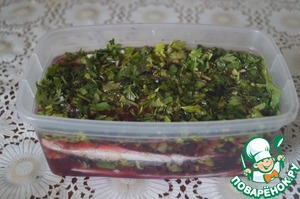 Скумбрию выкладывать в форму, посыпая каждый слой крупномолотым перцем, зеленью с чесноком и заливая маринадом. -