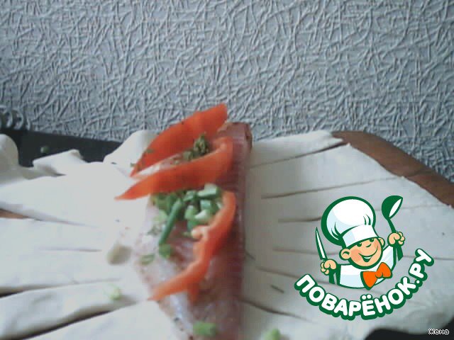 Отмораживаем тесто, раскатываем, делаем 12 - 15 надрезов с каждой стороны и готовим к фаршировке (смазываем маслом).