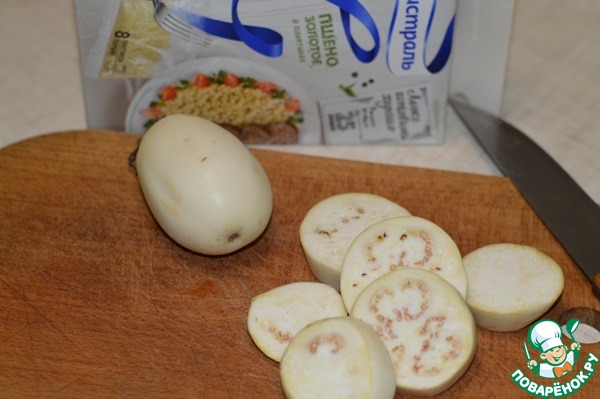 На тарелку выложить пшено, сверху ломтики баклажана.