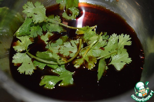 • 4. Соевый соус влить в сотейник, добавить веточки кинзы и довести до кипения.