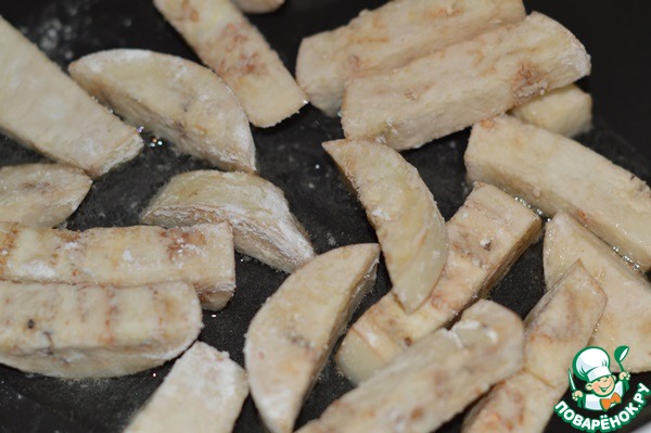 • 5. В сковороде разогреть масло, баклажаны смешать с крахмалом и быстро обжарить до золотистой корочки.
