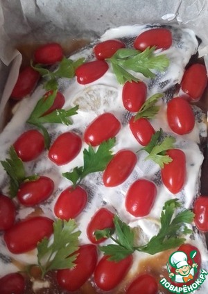 Сверху украшаем овощами, в моем случае это помидоры черри и петрушка (очень подойдут стебли сельдерея, но муж - не любитель). Закрываем фольгой и отправляем в духовку на 30 минут, после надо убрать фольгу и оставить еще на 10 минут, чтобы камбала подрумянилась. -