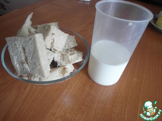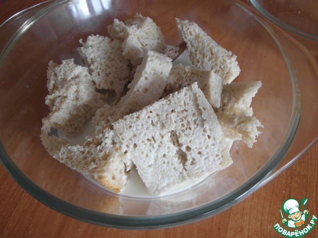 Пока лук обжаривается батон или просто хлеб (белый) отделяем от корочки и нарезаем кубиками, приготовим нужное количество молока.
