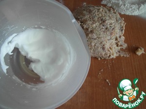 Яичный белок миксером взбиваем в крутую пену. (Делается это в чистой сухой чашке, чтобы хорошо взбилось). Проверяем: при переворачивании чашки с пеной, белковая пена не должна вытекать из чашки.