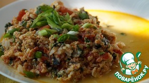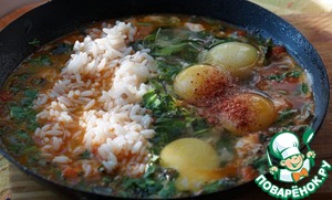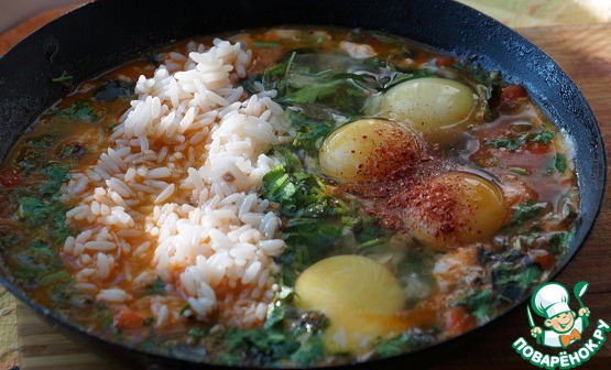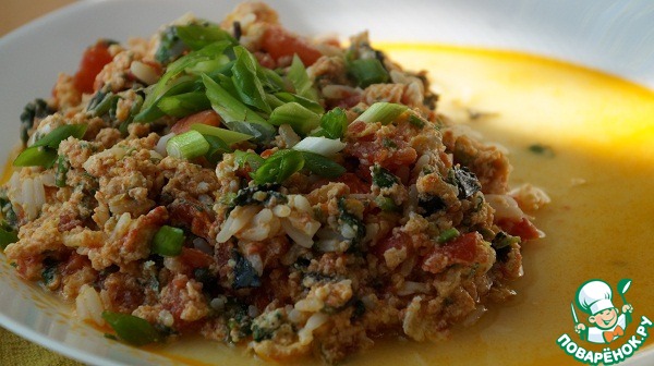 Высыпаем отварной рис, зелень, яйца, насыпаем специи, солим, перчим.