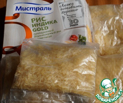 Кладем пакетик риса в кипящую подсоленную воду и варим 30 минут. Вынимаем пакет, даем стечь, рис готов.