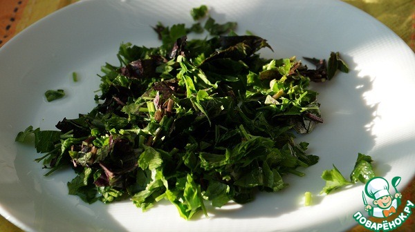 Обязательно базилик (реган), он дает сильный аромат, к нему добавляем травки по вкусу - у меня петрушка, кинза, реган и немного укропа. -
