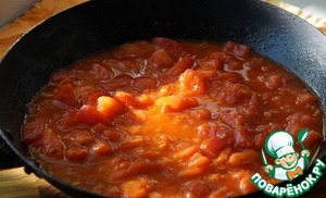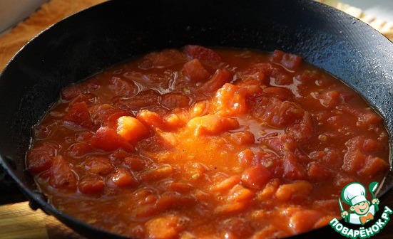 Ставим на огонь и начинаем тушить до того момента, пока масса не начнет превращаться в соус, но помидоры будут еще кусочками.