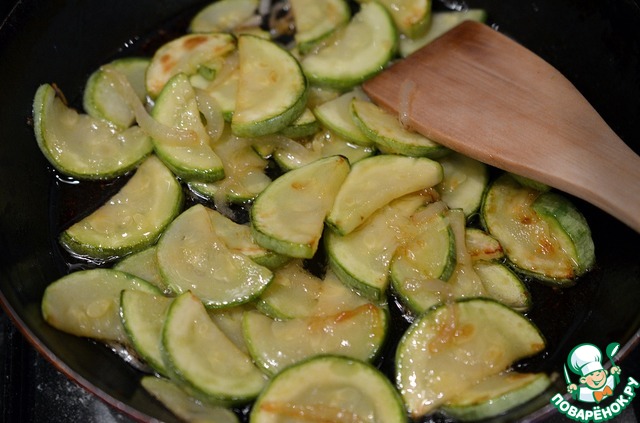 • Пока варится рис, кабачок и лук нарежем полукольцам.
