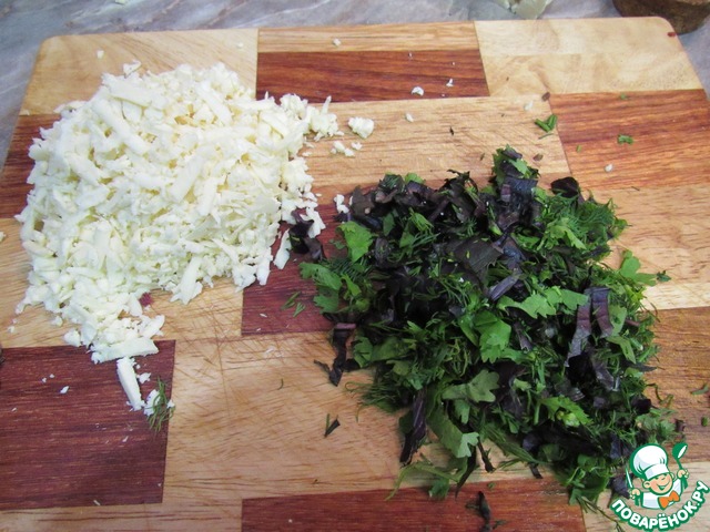 Добавляем зелень и жарим, постоянно помешивая. Начинка готова, когда брынза начнет растягиваться тонкими нитками.