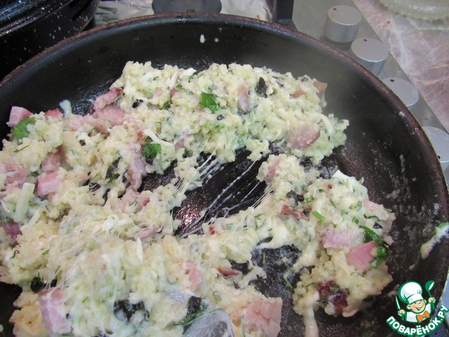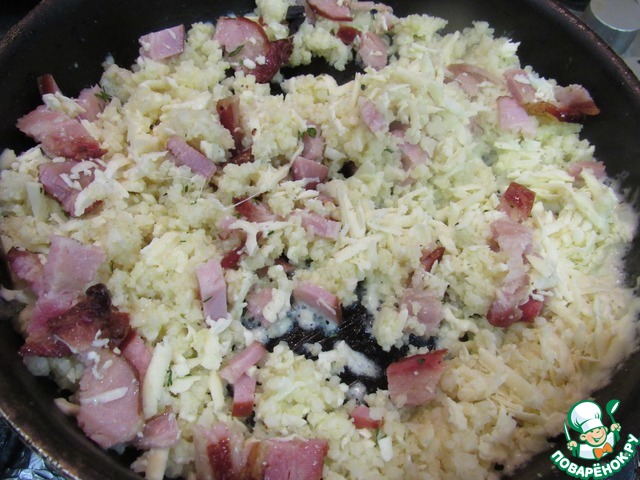 Добавляем пшено, бекон и сыр. -