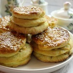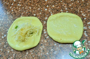 Начиная с первого колобка, раскатать в кружок, смазать растопленным сливочным маслом, в середину выложить щепотку сыра.