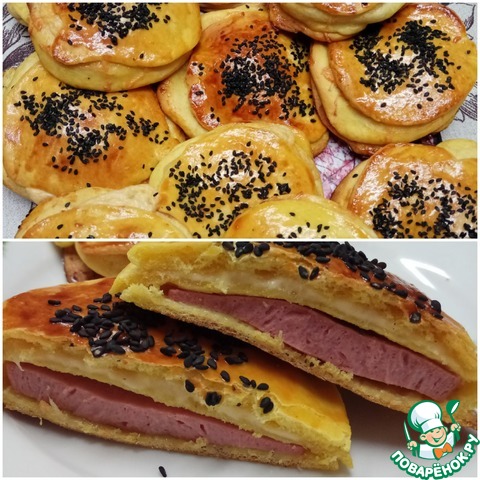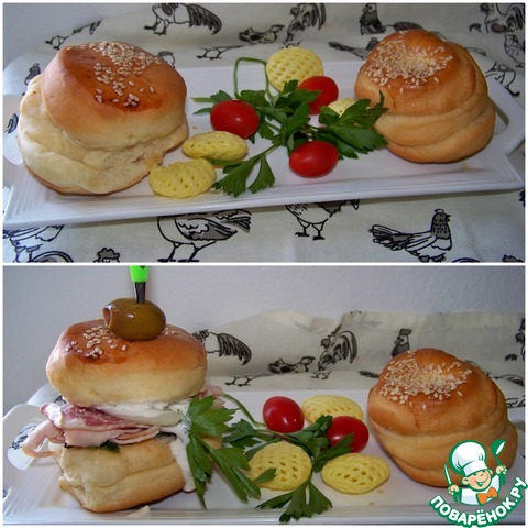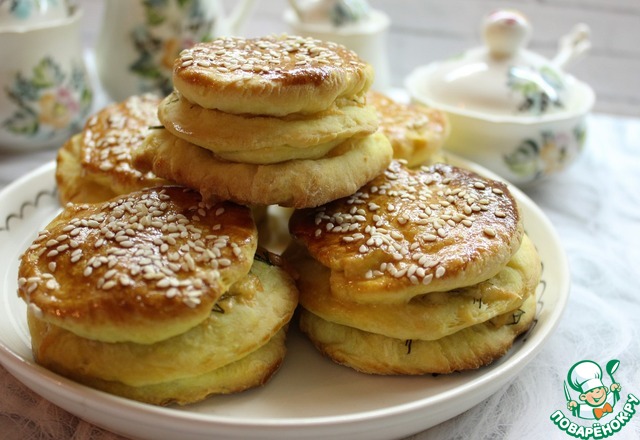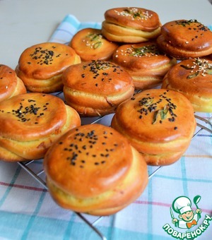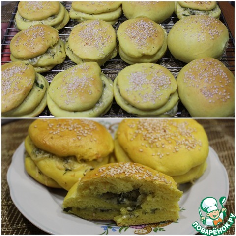 Расстоявшиеся булки смазать желтком, посыпать кунжутом, зеленью. Выпекать при 180 - 190 градусах 25 минут, до красивого румянца.