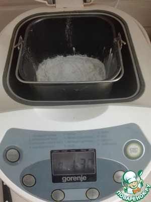 Всыпаем сверху муку и задаем программу "Тесто". Программа занимает около 1,5 часов. Если у вас нет хлебопечки, либо вы не любите готовить тесто в ней, все можно вымесить руками