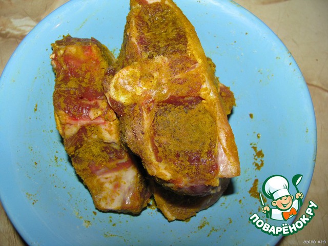 Мясо посолить, посыпать специями (в состав индийского карри входит: паприка, перец чили, тмин, кориандр, белая горчица, куркума, имбирь, чёрный перец, пажитник, корица, лист карри).