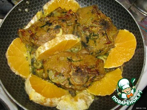 Апельсин нарезаем дольками и добавляем к мясу. Оставляем на 10 минут.