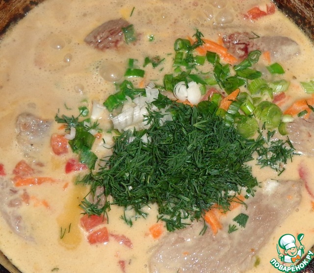 Добавить воду, по вкусу соевый соус, сметану и приправу для мяса. Перемешать, тушить 7 минут под закрытой крышкой.