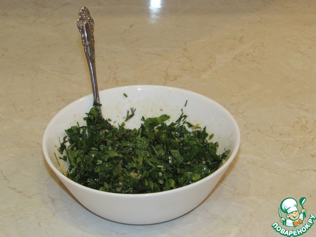 Берем любую зелень какую вы любите, у меня укроп, петрушка и кинза. Пучок, можно смело брать побольше. Нарезаем мелко.