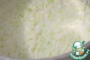 Смешать с кабачком, добавить яйца, специи, манку и соль, хорошо перемешать.