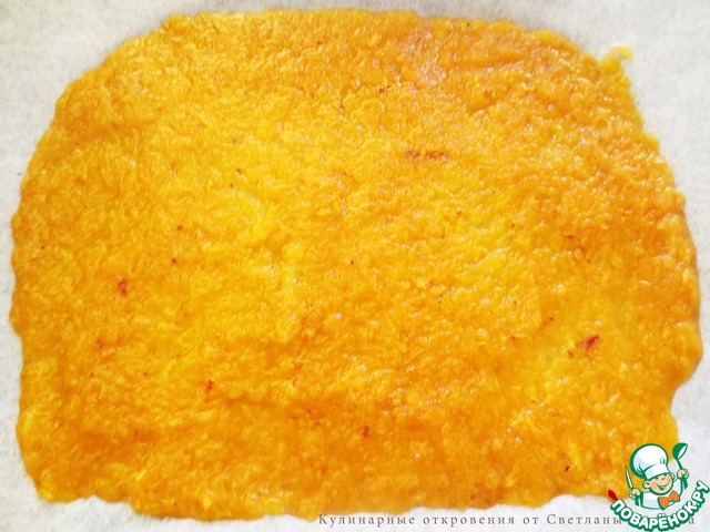 Противень застелить пекарной бумагой, выложить персиковое пюре. Распределить равномерным слоем на поверхности бумаги