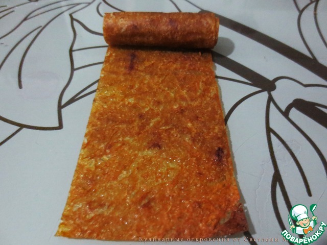 Духовку разогреть до 120 градусов и оправить туда пастилу на 2-3 часа. Каждые 15 минут проверяем готовность пастилы.
