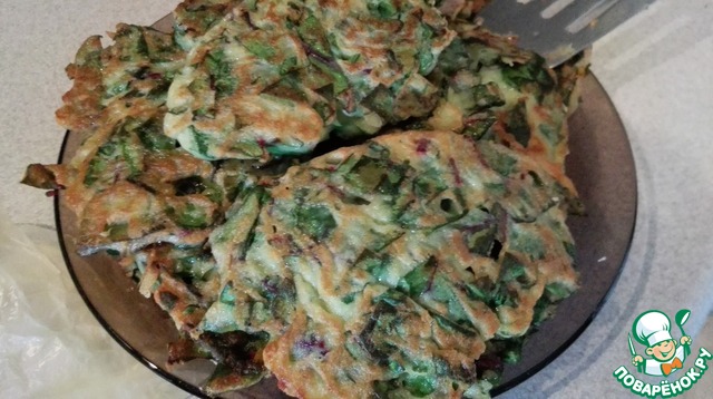 Только что сняла пробу. Вкуснятина! Мне оладушки напомнили цуккини. Помимо сырого добавила ещё вареное яйцо( просто заволялось в холодильнике ). Майонез пополам со сметаной. Завтра на работе буду выпрашивать у наших огородниц и дачнич ботву.