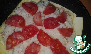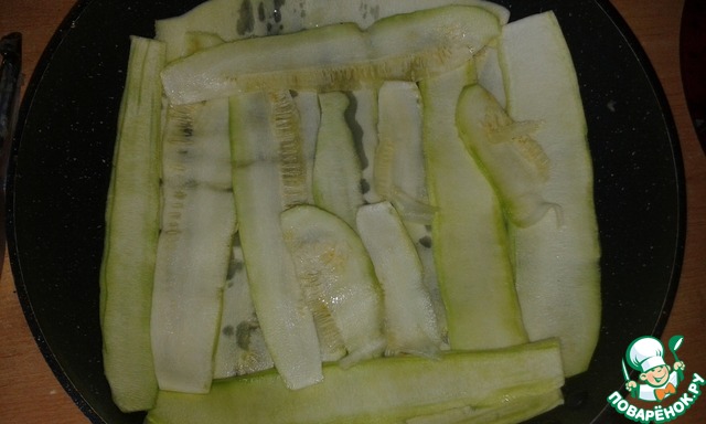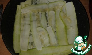 Сковороду смазать маслом и сложить тонкие слайсы кабачков, закрывая дно и немного стенок -