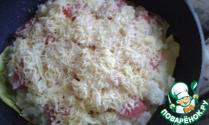 Все залить взбитыми венчиком или вилкой яйцами и посыпать тертым сыром