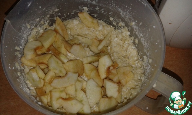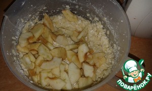 Добавить 2 яблока, нарезанных тонкими дольками и снова перемешать