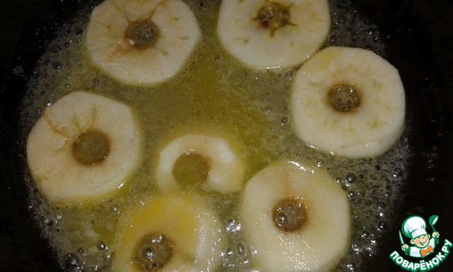 Растопить 30 г масла на сковороде, добавить сахар и карамелизовать яблоки по минутке с каждой стороны. -