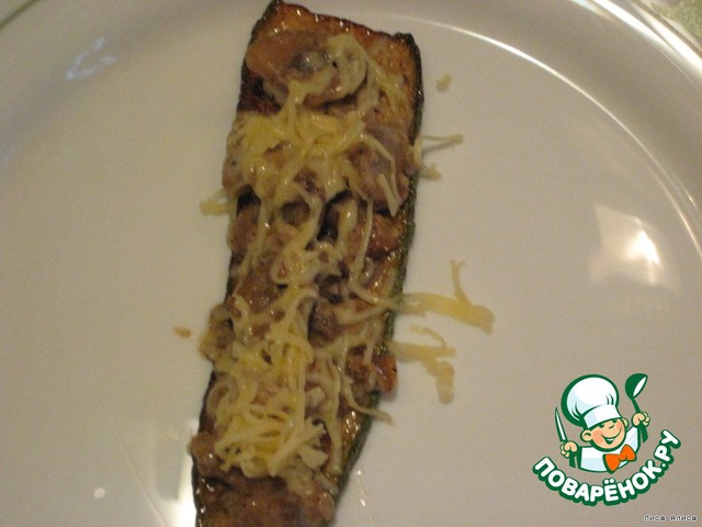 • На готовую кабачковую пластинку выкладываем грибы, посыпаем тертым сыром.