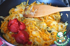 Добавить томатную пасту (2 ст. ложки), воду (2/3 стакана), лавровый лист. Смесь тушить несколько минут (5-10 мин.)