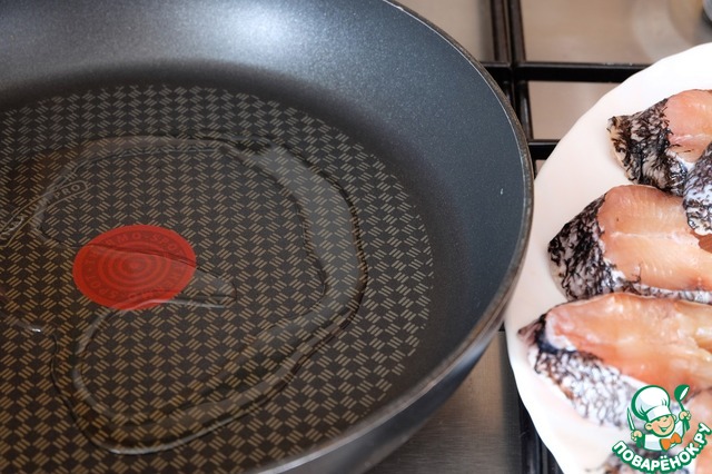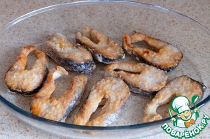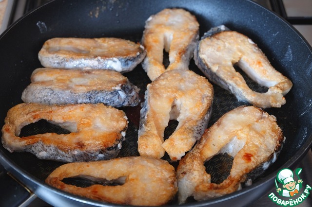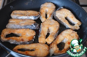 Стейки щуки посолить, запанировать в муке, излишки муки стряхнуть.