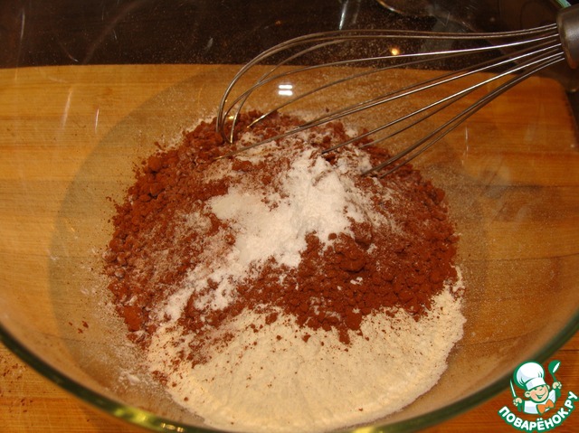 Сначала смешиваем сухие ингредиенты, это мука, какао-порошок, сода, ванилин, разрыхлитель и соль.