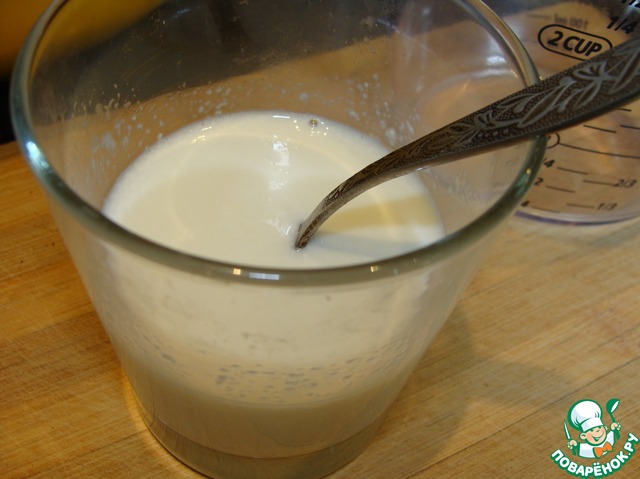 Дальше влажные ингредиенты. Пахта - чудо чудное, ее используют все американские повара для выпечки. Не найти в наших магазинах, только на рынках сельскохозяйственных. Обычно я заменяю на кефир, нежирный, эффект тот же. Сейчас решил попробовать сделать что-то похожее на пахту. Взял молоко и добавил одну ст. ложку лимонного сока (можно использовать уксус), нужно подождать 10 мин. и псевдо-пахта готова. В рецепте сработала на отлично.