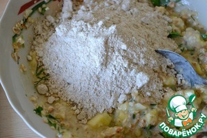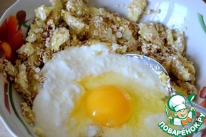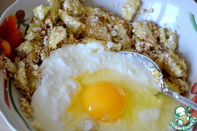 В кабачки насыпаем хлопья, кладем тертый чеснок, йогурт и разбиваем яйцо.
