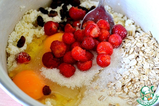 Кладем сахар, соль, яйца, промытый изюм и клубнику