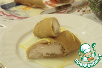 На блинчик выкладываем домашний сыр и размазываем его ножом.