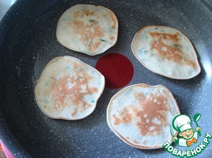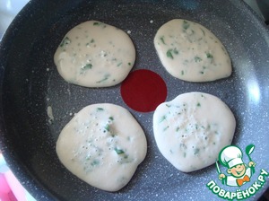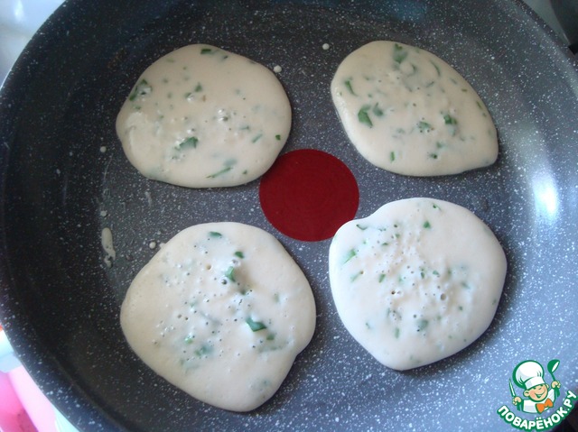 На разогретую сковороду (у меня антипригарная и я её не подмазала) ложкой наливала тесто, по 2 ст. л на один блинчик.