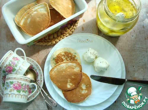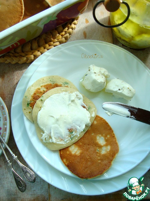 Маленькие блинчики с отрубями и припёком из петрушки для завтрака с домашним сыром.