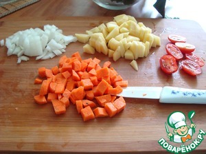 Ставим бульон на плиту, доводим до кипения и отправляем в него овощи, произвольно нарезанные.