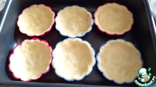 Разделить тесто на 16 частей, каждую раскатать в лепёшку выложить в формочку, прижать пальцами.
