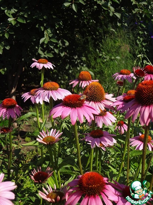 Подсолнухи, высаженные небольшими группами здесь и там, и различные многолетники, которые растут сами по себе.