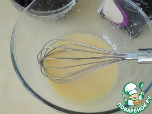 Добавляем масло в яично-сахарную смесь и тщательно, взбивая венчиком, перемешиваем.