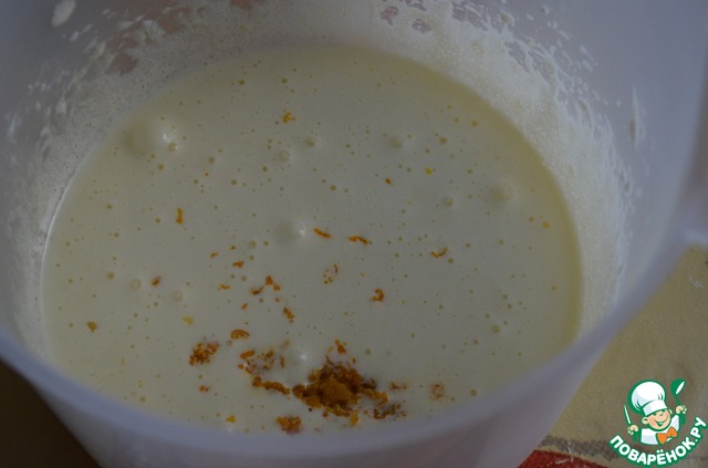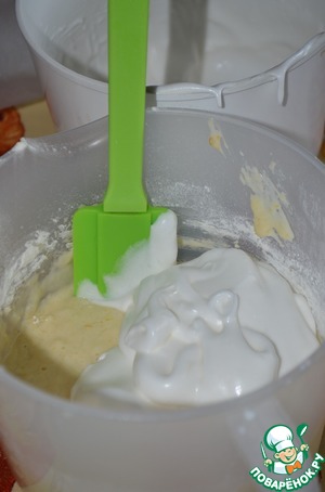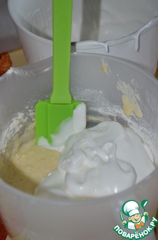 Белки взбить с оставшимся сахаром до устойчивых пиков и ввести в тесто, осторожно размешивая.