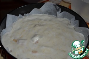 Форму выложить бумагой для выпечки, смазать маслом, присыпать сухарями и выложить тесто.