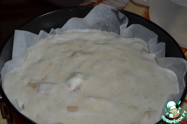Яблоки очистить от кожуры, разрезать на небольшие кусочки и добавить в тесто.